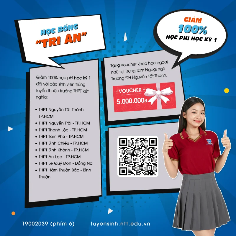 b) Tặng voucher khóa học ngoại ngữ trị giá 5.000.000 đồng tại Trung tâm Ngoại ngữ - Trường ĐH Nguyễn Tất Thành.