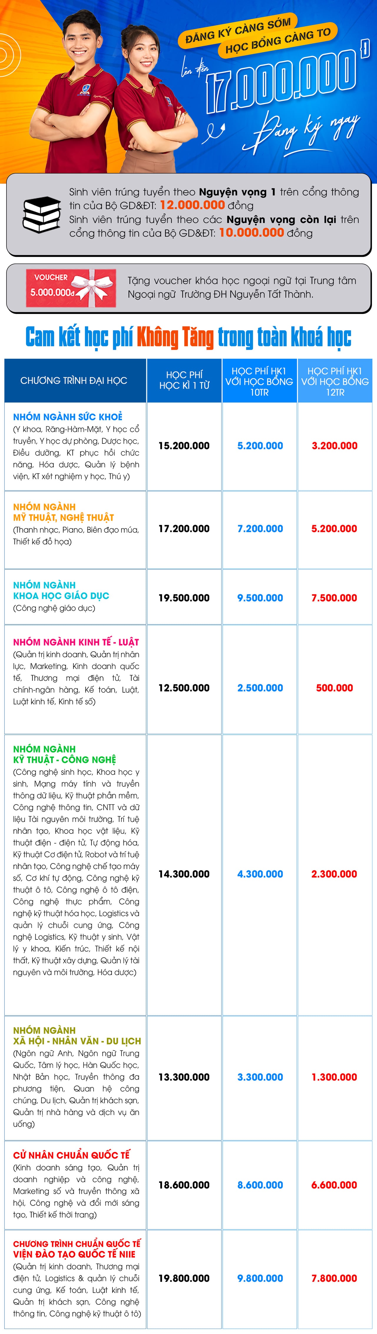 | 3 | Vợ, chồng, con, anh, chị, em ruột của CB-GV-NV của trường NTTU | 20% học phí toàn khóa |