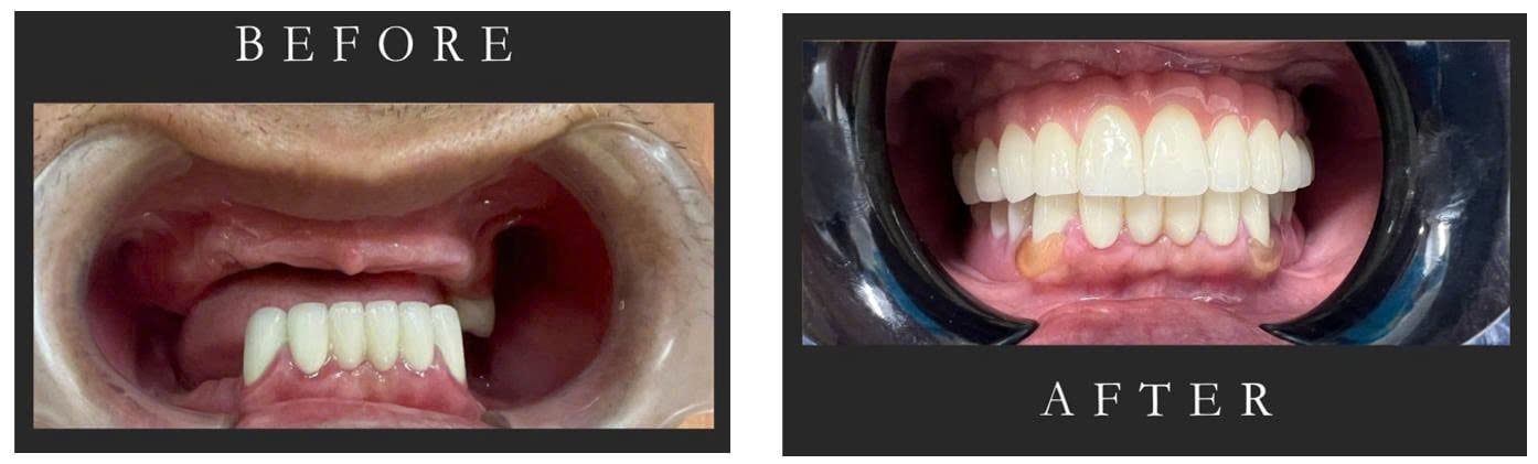 Hình một người mất nhiều răng ở hàm trên và hàm dưới. Hình sau khi phẫu thuật cắm implant và phục hình răng trên implant ở hàm trên, hàm phục hình tháo lắp vùng răng ở hàm dưới (do TS.BSCKII. Nguyễn Hiếu Tùng và ThS.BS. Lê Đỗ Tuấn Kiệt – giảng viên NTTU thực hiện điều trị).