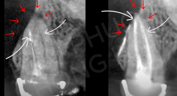 Một răng cối lớn hàm trên đã điều trị nội nha từ nơi khác nhưng thất bại bị nhiễm trùng quanh chóp (A), đến giảng viên NTTU điều trị nội nha lại thành công (B). Ca lâm sàng điều trị nội nha lại do BSNT.CKI. Lê Hồng Hải và BSNT.CKI. Huỳnh Nguyễn Hữu Phước – Giảng viên NTTU điều trị.