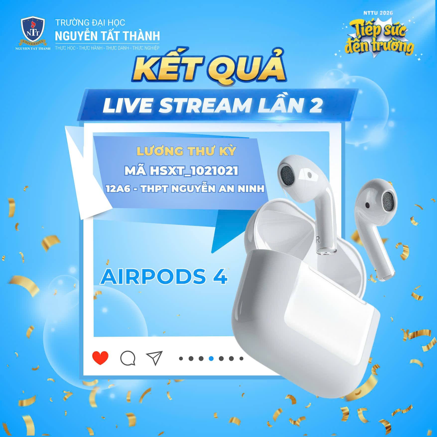 XIN CHÚC MỪNG BẠN "TRẦN THỊ TUYẾT NHƯ" ĐÃ MAY MẮN GIÀNH ĐƯỢC GIẢI ĐẶC BIỆT LÀ 1 CHIẾC AIRPODS 4 TRONG BUỔI LIVESTREAM LẦN 4