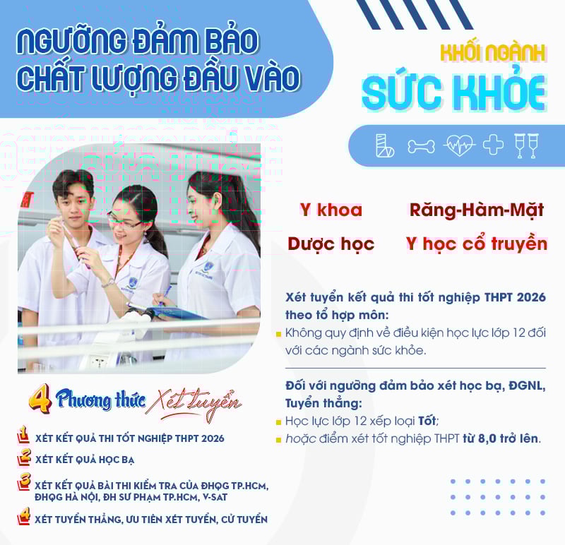 * Lưu ý: xét theo điểm thi tốt nghiệp THPT, không quy định về điều kiện học lực lớp 12 đối với các ngành sức khỏe.