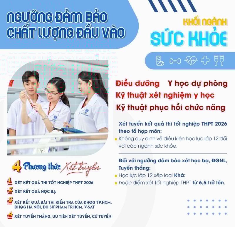 Các ngành thuộc khối khoa học sức khỏe (Y khoa, Dược học, Y học cổ truyền, Y học dự phòng, Điều dưỡng, Kỹ thuật xét nghiệm y học, Kỹ thuật phục hồi chức năng) xét theo quy định về ngưỡng đảm bảo chất lượng đầu vào của Bộ GD&ĐT.